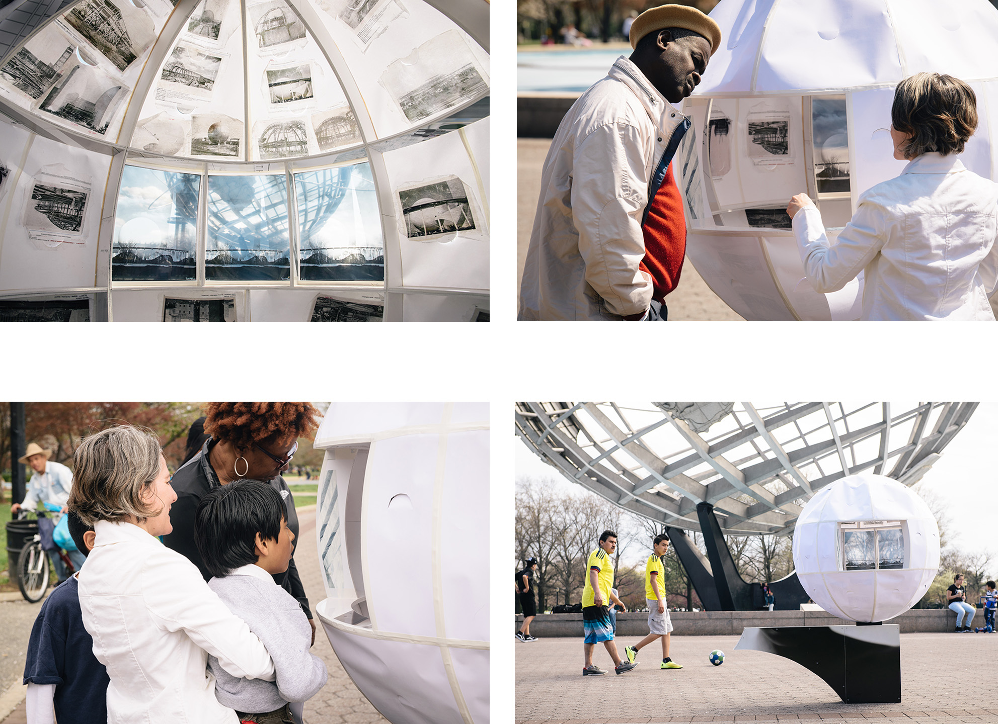 We met at the Unisphere in Flushing Meadows-Corona Park in Queens to bring the 1939-1940 World’s Fair back home to the fairgrounds to view the past through the past in the present with the mobile gallery (based on the Trylon and Perisphere) of images from the fully digitized collection of images from the 1939-1940 World’s Fair archive at the New York Public library (an orphan-only archive).