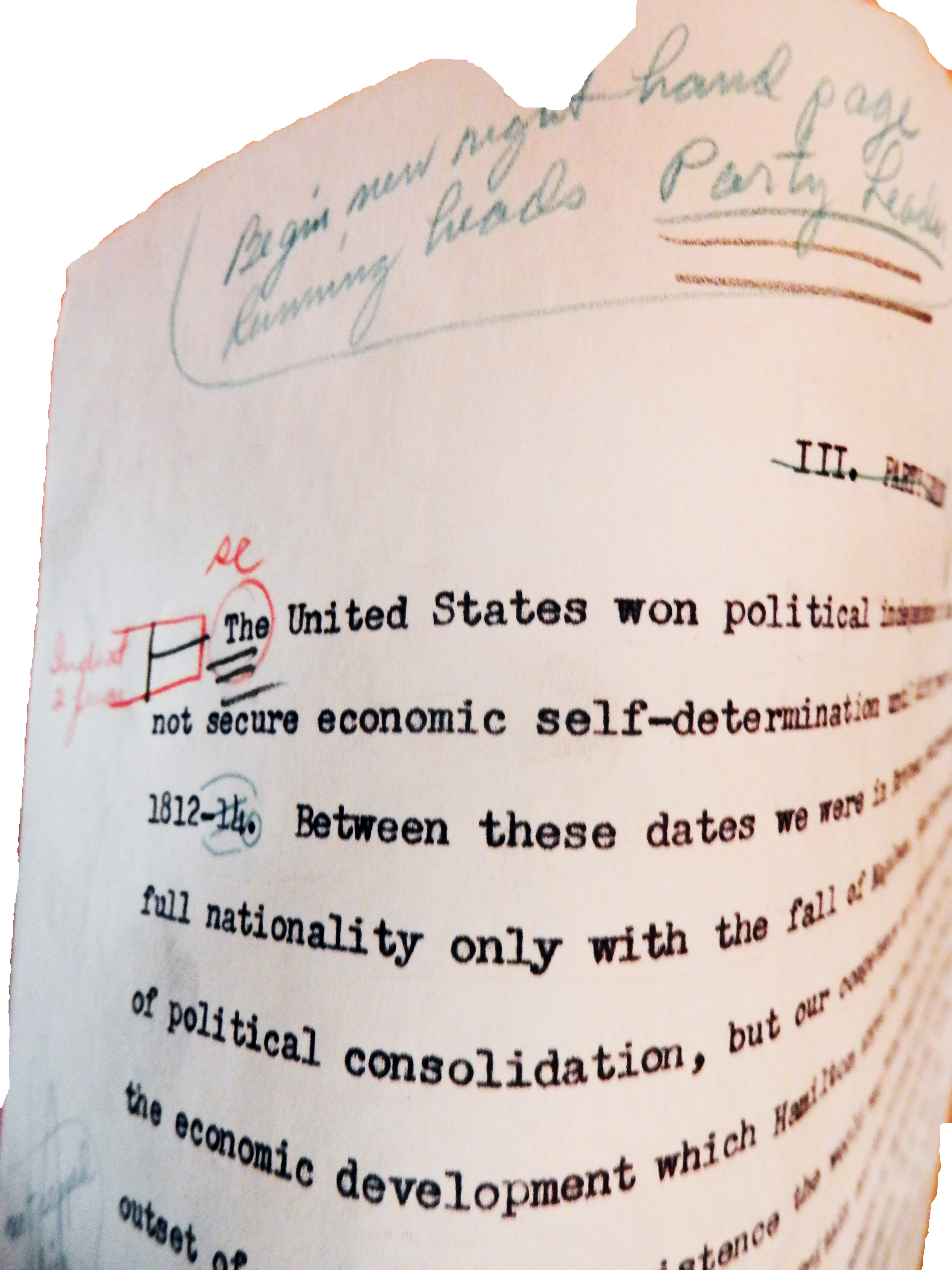 This manuscript is from the Typescripts collection of the New York Public Library. This collection is unusual because it has been created “synthetically,” that is, from a variety of sources. In it are typed, corrected manuscripts from a variety of published and unpublished authors. The hand of the author and editor become visible in the markings and fingerprints, bringing flesh to the page. The digital copy preserves and erases this fleshly mark.